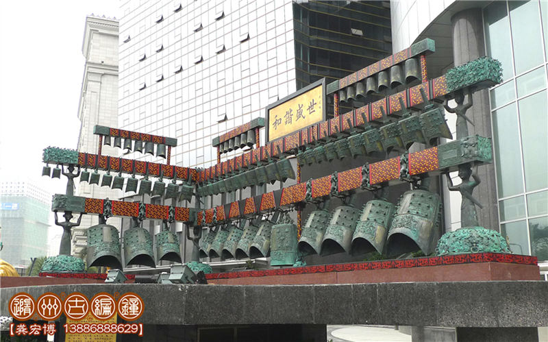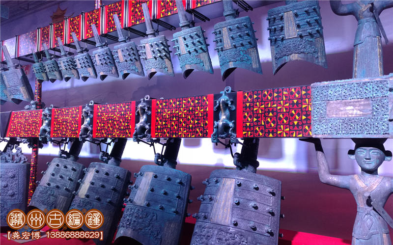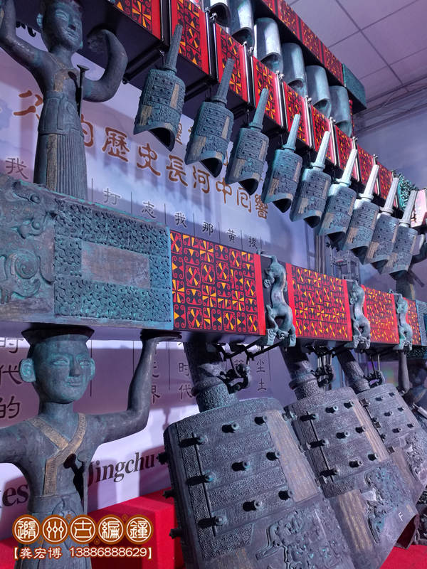 技術(shù)標(biāo)準(zhǔn):鑄件要求紋飾清晰,表面光潔,無(wú)裂、刺、孔、糙等鑄造缺陷;整套編鐘音域5個(gè)八度,一鐘雙音,按國(guó)際標(biāo)準(zhǔn)A=440Hz調(diào)音,音準(zhǔn)控制在±5Hz內(nèi),音色統(tǒng)一協(xié)調(diào),無(wú)雜、啞音響。其中下層13件為倍低音甬鐘,在演奏中起到烘托氣氛的作用,中層33件為中音域甬鐘,十二半音齊備,主要用于演奏主旋律,上層19件為被高音鐘和補(bǔ)音鐘,也是重要的半音和補(bǔ)充被高音音域,3組設(shè)計(jì)可以用于演奏復(fù)試旋律。其結(jié)構(gòu)、配件、銘文等全部按照曾侯乙編鐘樣式仿制。
