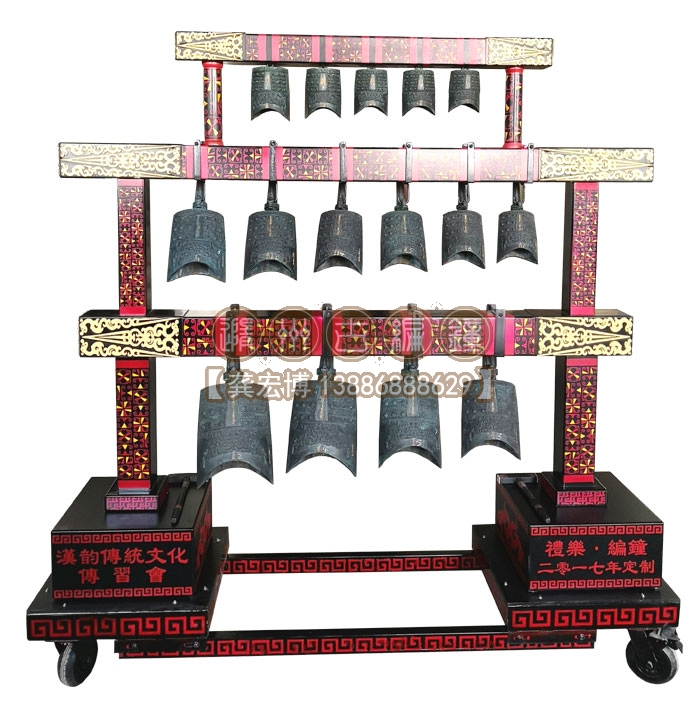 合肥漢韻文化傳習會定制的15件3層編鐘長1.9米、高1.86米、寬0.5米,音律齊全,演奏使用方便,木架上可以彩繪客戶定制文字或圖案,底部安裝鋼制滑輪,安裝移動都非常方便,配有樂器標準航空箱,外出表演得心應手。